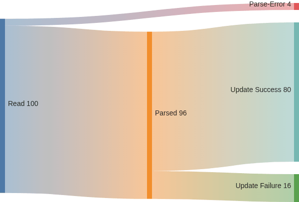 The result structure now has enough information to track input records through both initial read and downstream update operations, and armed with this sort of data, we can create a sankey diagram in mermaid to show these results graphically. Here’s the mermaid syntax: